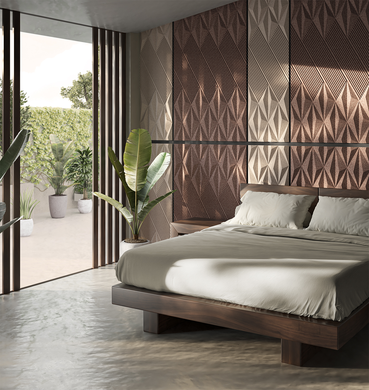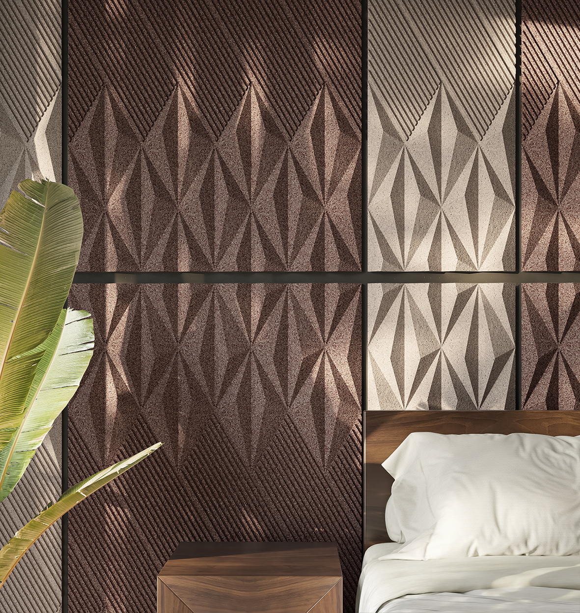 La revêtement mural NAXOS en liège se présente sous forme d’un sublime diamant travaillé .